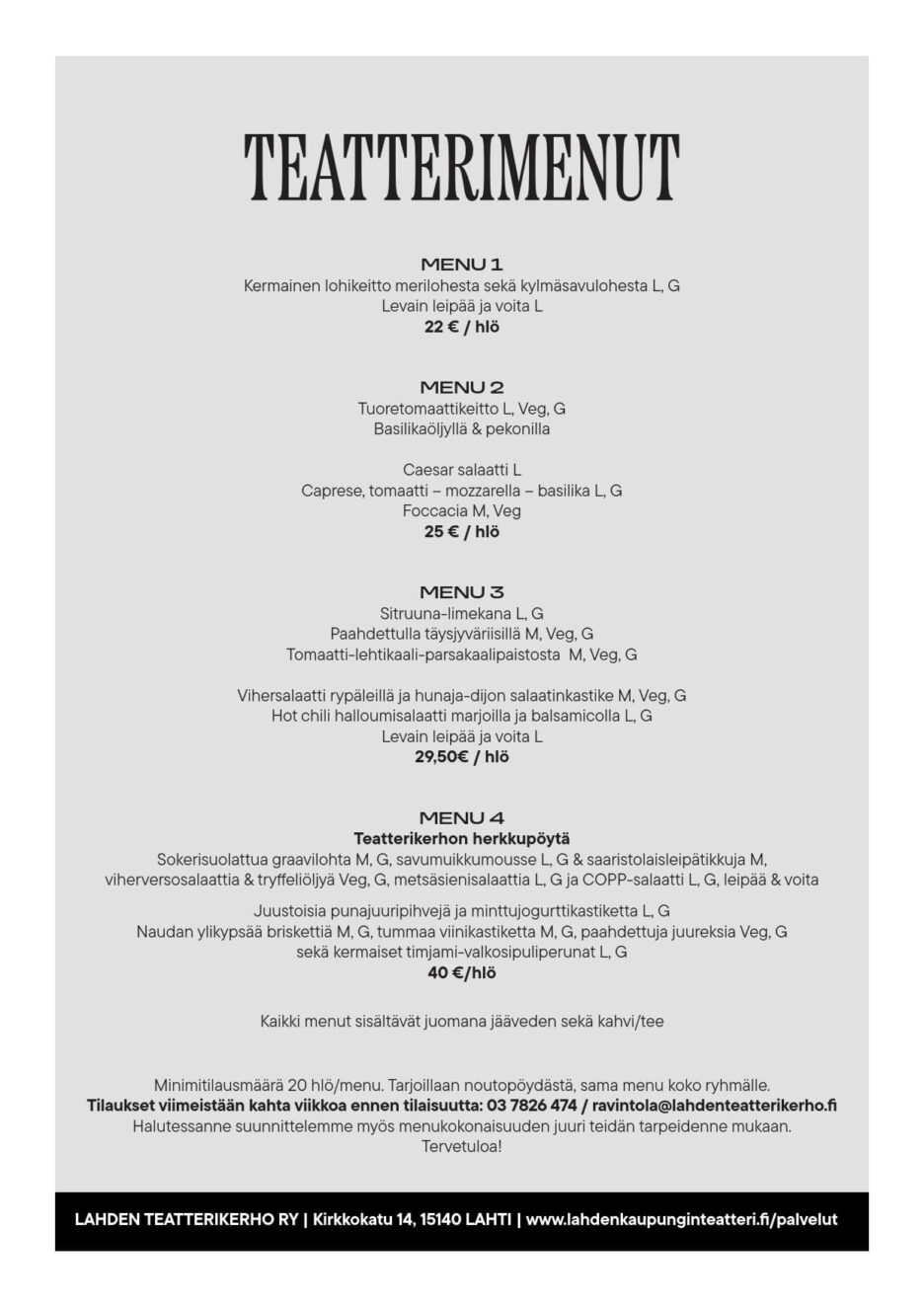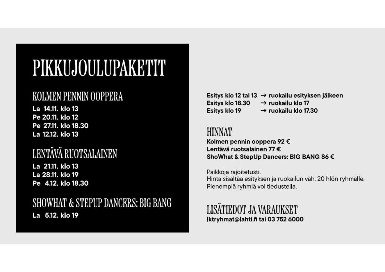 Ryhmä- ja yritysmyynti (03) 752 6000, ti-pe klo 10-16 / lktryhmat@lahti.fi